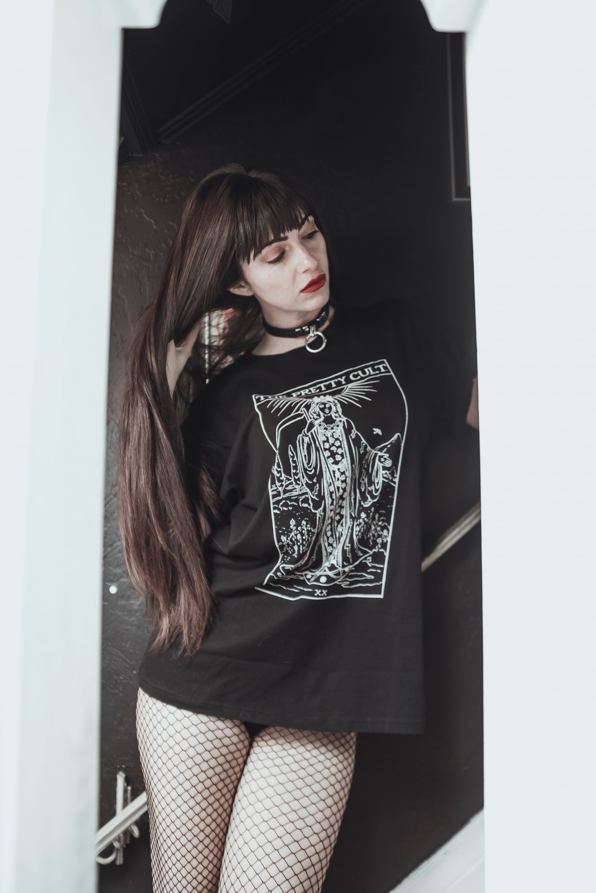 Face the darkness with the Lady Reaper Tee from The Pretty Cult. Featuring an exclusive graphic of a reaper goddess, this unisex black tee embodies feminine power, mortality, and mystic transformation. Designed for those who walk the line between gothic edge and witchy style, it’s the perfect statement piece for any occult-inspired wardrobe.