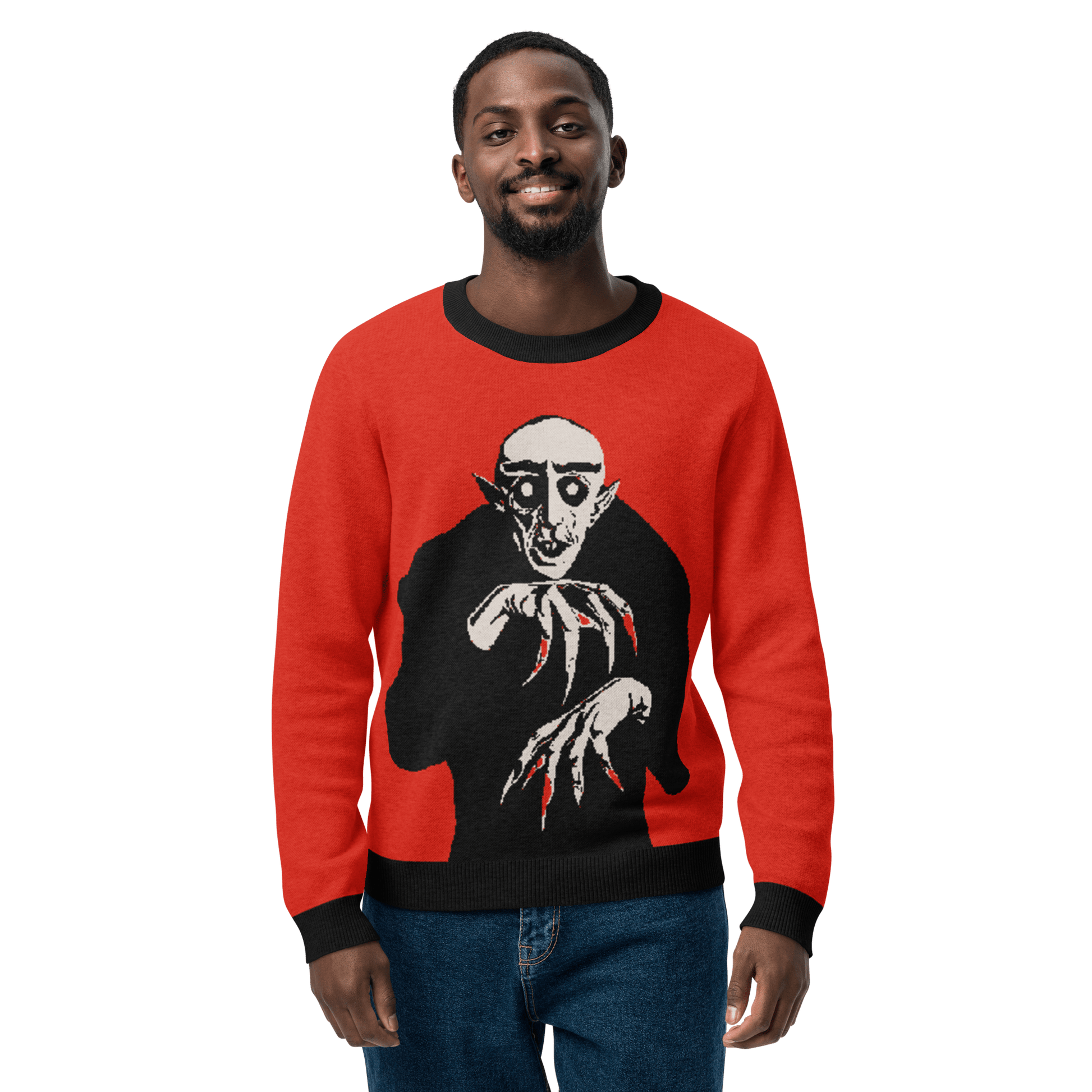 Pay homage to classic horror with this red knit sweater featuring a creepy depiction of Count Orlok. No, not that one, but the one that was genuinely creepy before Bill Skarsgard did his incredible depiction.  Crafted with lightweight comfort and gothic style in mind, this unisex sweater is a must-have for horror film fans and dark fashion enthusiasts alike.